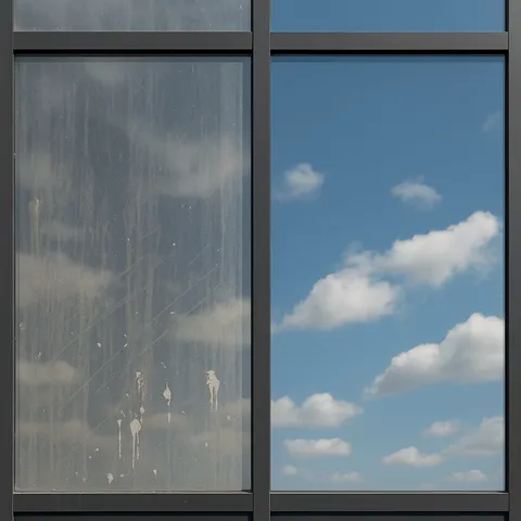 Пыль, городская уличная грязь, следы дождя, лёгкие разводы, тусклость стекла после эксплуатации |
