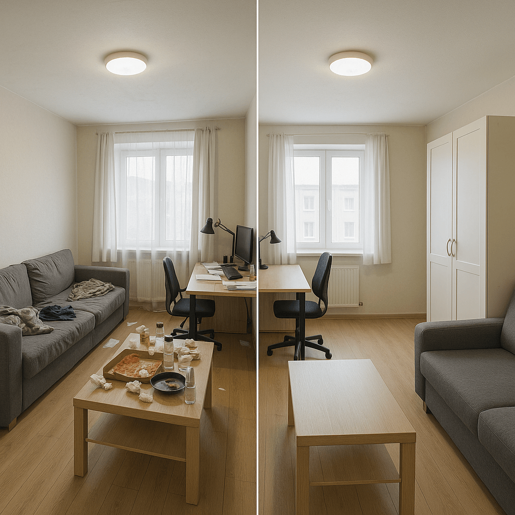 На практике плотная расстановка мебели и обилие личных вещей на виду сильно усложняют процесс. Хаотичные попытки навести порядок без четкой системы напоминают дефрагментацию переполненного жесткого диска.