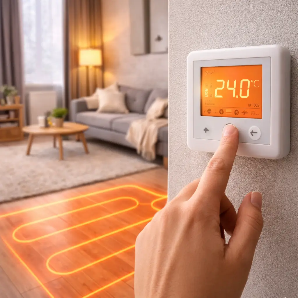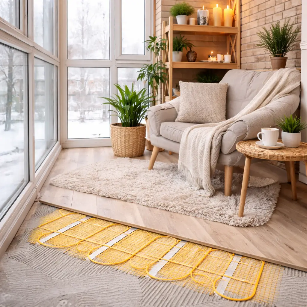Электрическая система обогрева под напольным покрытием создаёт равномерное распределение тепла от основания до потолка. Под плиткой, ламинатом или иным покрытием укладывается кабель или маты — греющий элемент, питающийся от сети. Нагреваясь, он передаёт тепло стяжке, затем — финишной отделке. В результате пол превращается в источник мягкого, приятного обогрева.