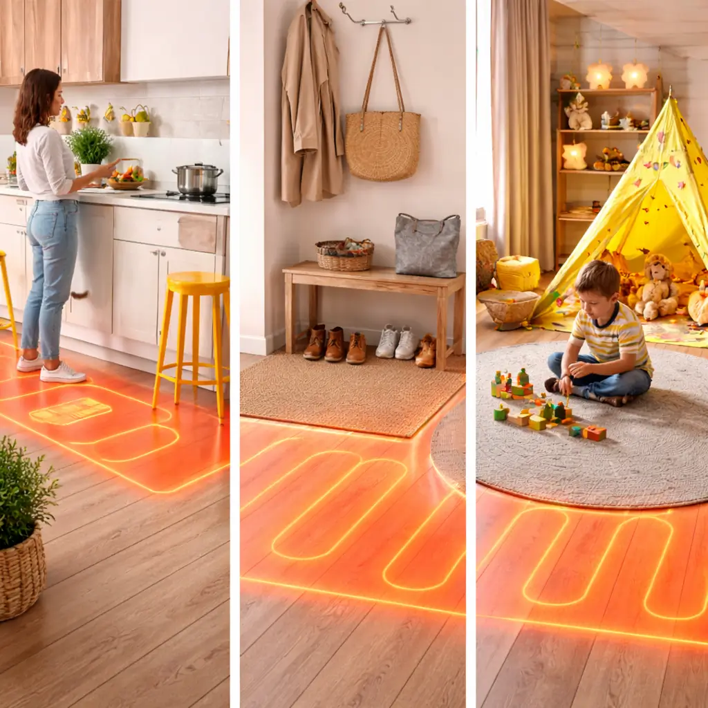 Систему можно применять в разных помещениях: ванна, кухня, спальня, прихожая. Даже в детской безопасно. Полов с подогревом в доме становится всё больше, потому что это удобно. Подходит почти под любые покрытия — главное, выбрать правильный режим.