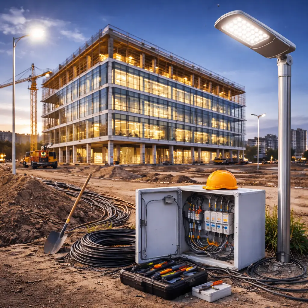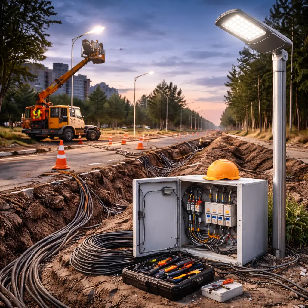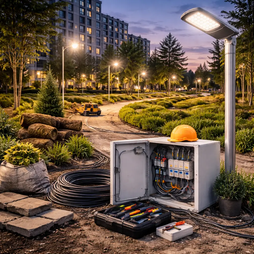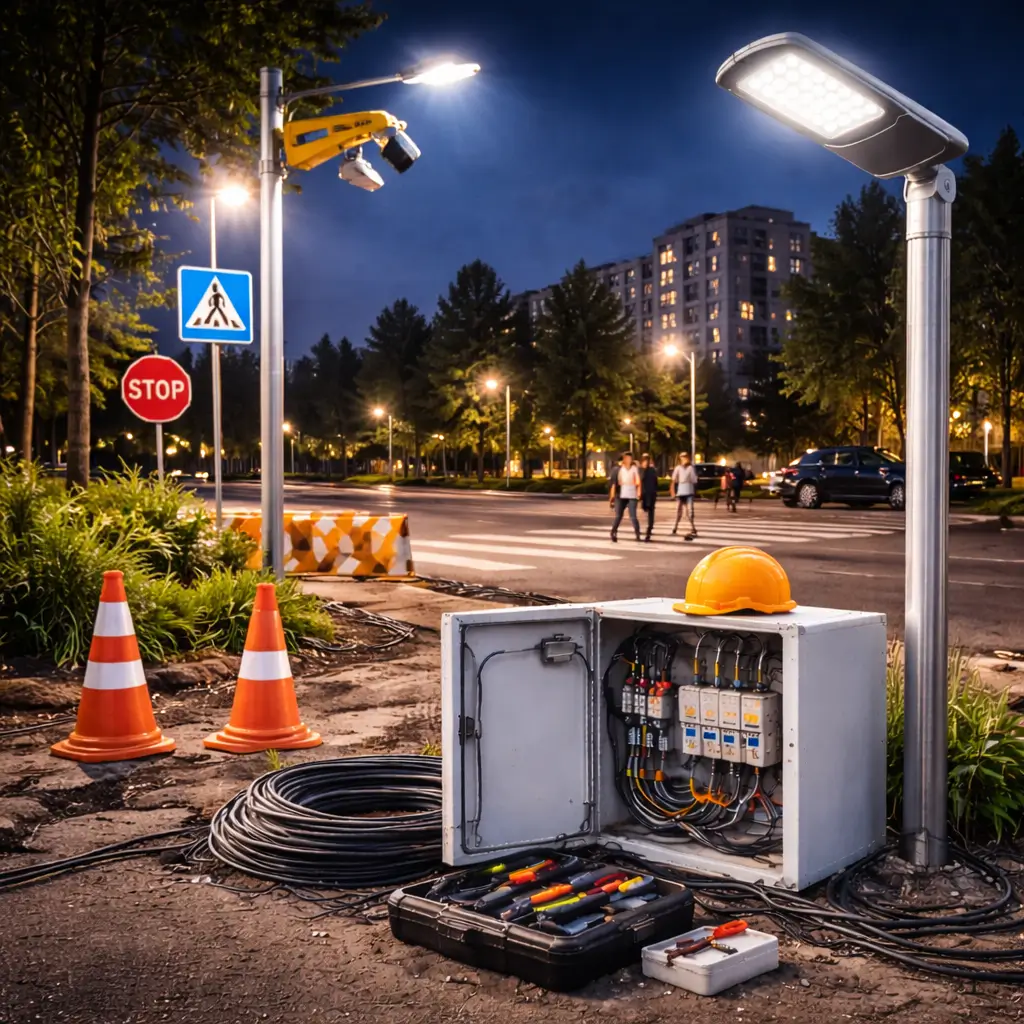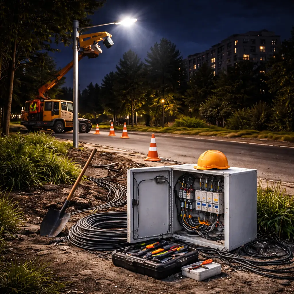 Проще и дешевле обходится установка на готовых столбах и прямая прокладка кабеля. Монтаж высоких опор с нуля или подземных линий через асфальт — дороже. На стоимость влияют и дополнительные элементы: датчики, автоматы, декоративная подсветка.