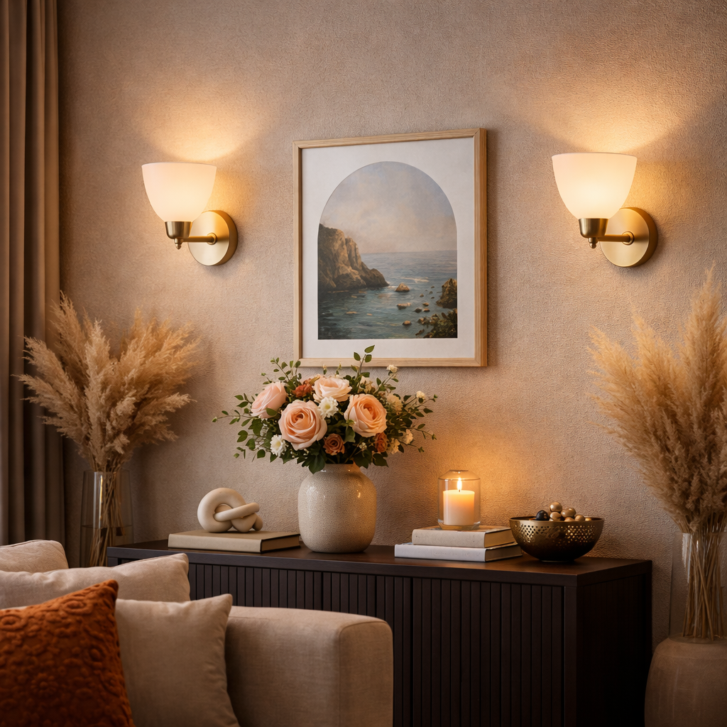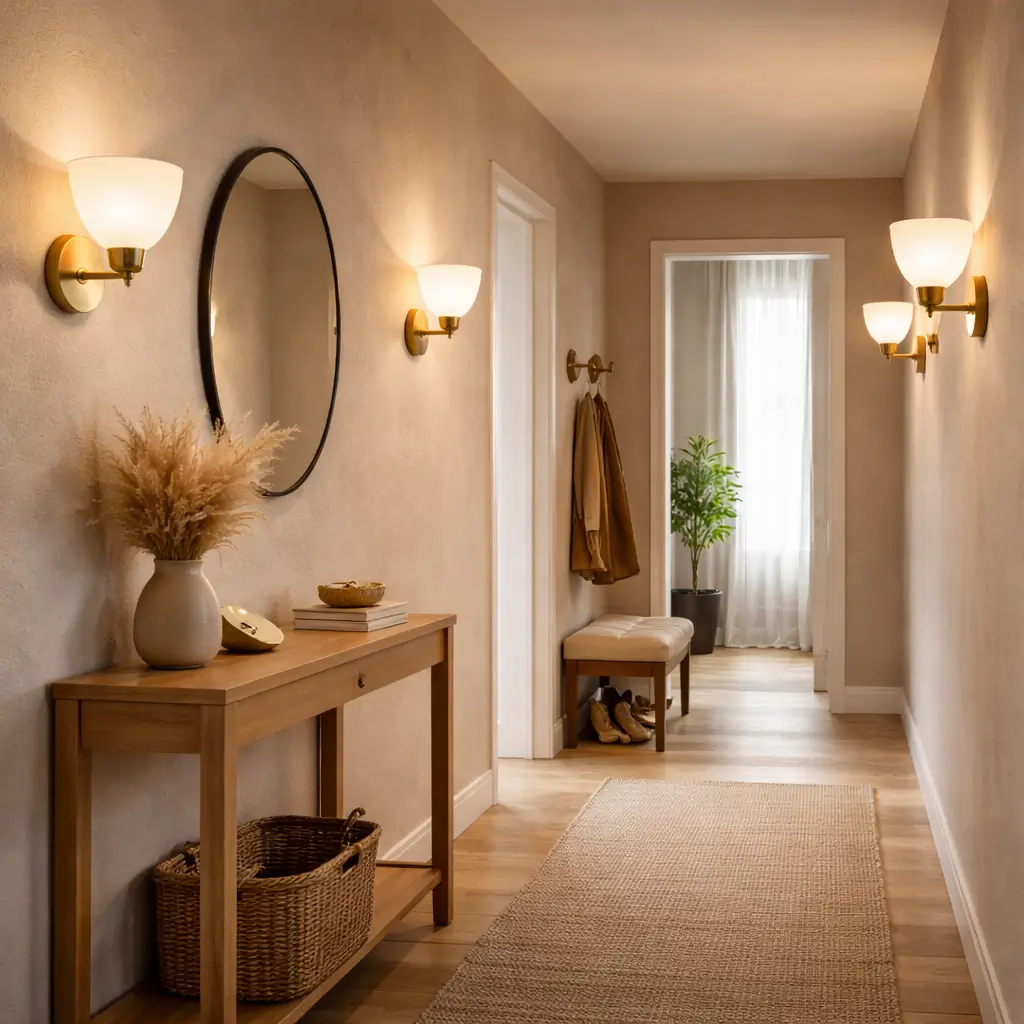 В коридоре настенные светильники решают сразу две задачи — освещают и украшают пространство. Особенно удобны в узких проходах, где экономят место. Оптимальная высота — 1,8–2 метра, чтобы свет не бил в глаза и не мешал при движении. Также их устанавливают в гостиной для подсветки картин, ниш, а во влажных зонах — в ванной, возле зеркала, используют влагозащищенные модели.