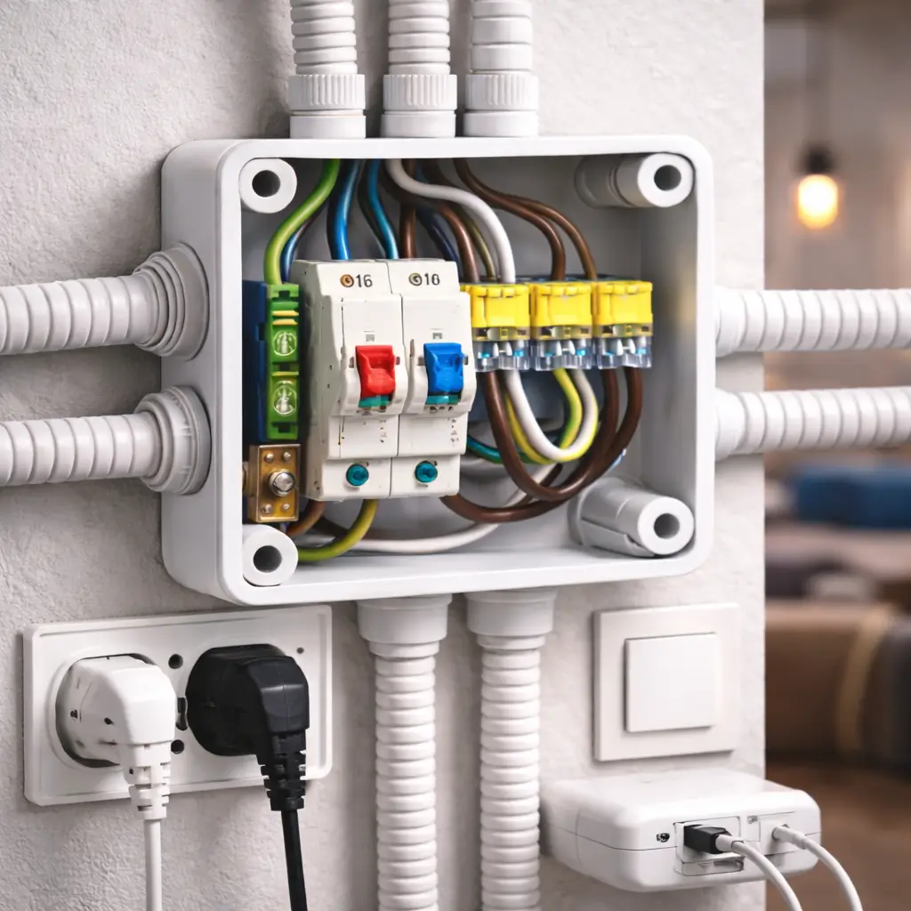 Большинство соединительных узлов выполняется из металла либо негорючего полимера. Верный выбор зависит от условий эксплуатации, совместимости с другими элементами сети (розетками, каналами, кабелем). Также учитывается визуальное соответствие — накладные узлы часто подбирают под цвет стен и стиль интерьера.