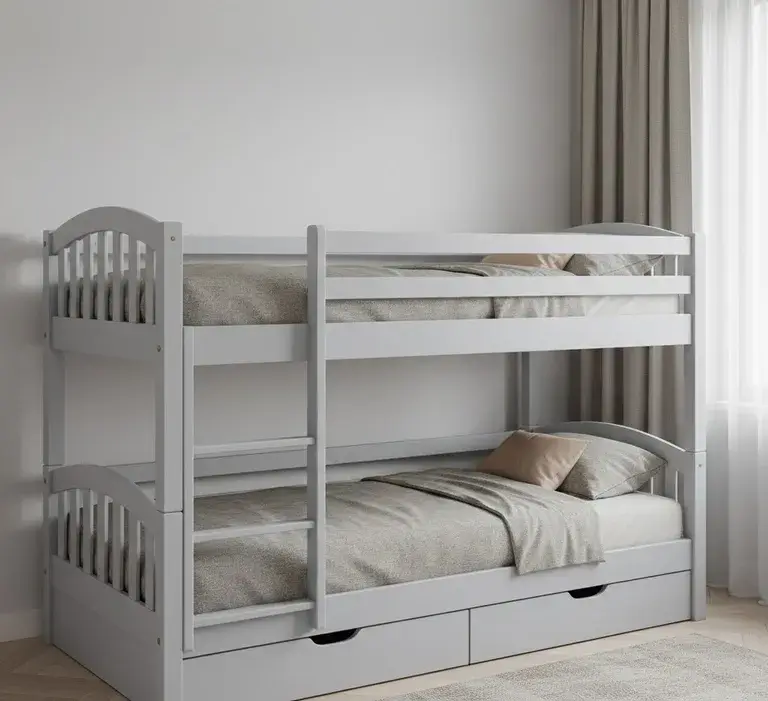 Каркас шкант+конфирмат, крепёж к стене 6×80 мм. Двухъярусная кровать выдерживает до 120 кг/ярус — не шатается.
