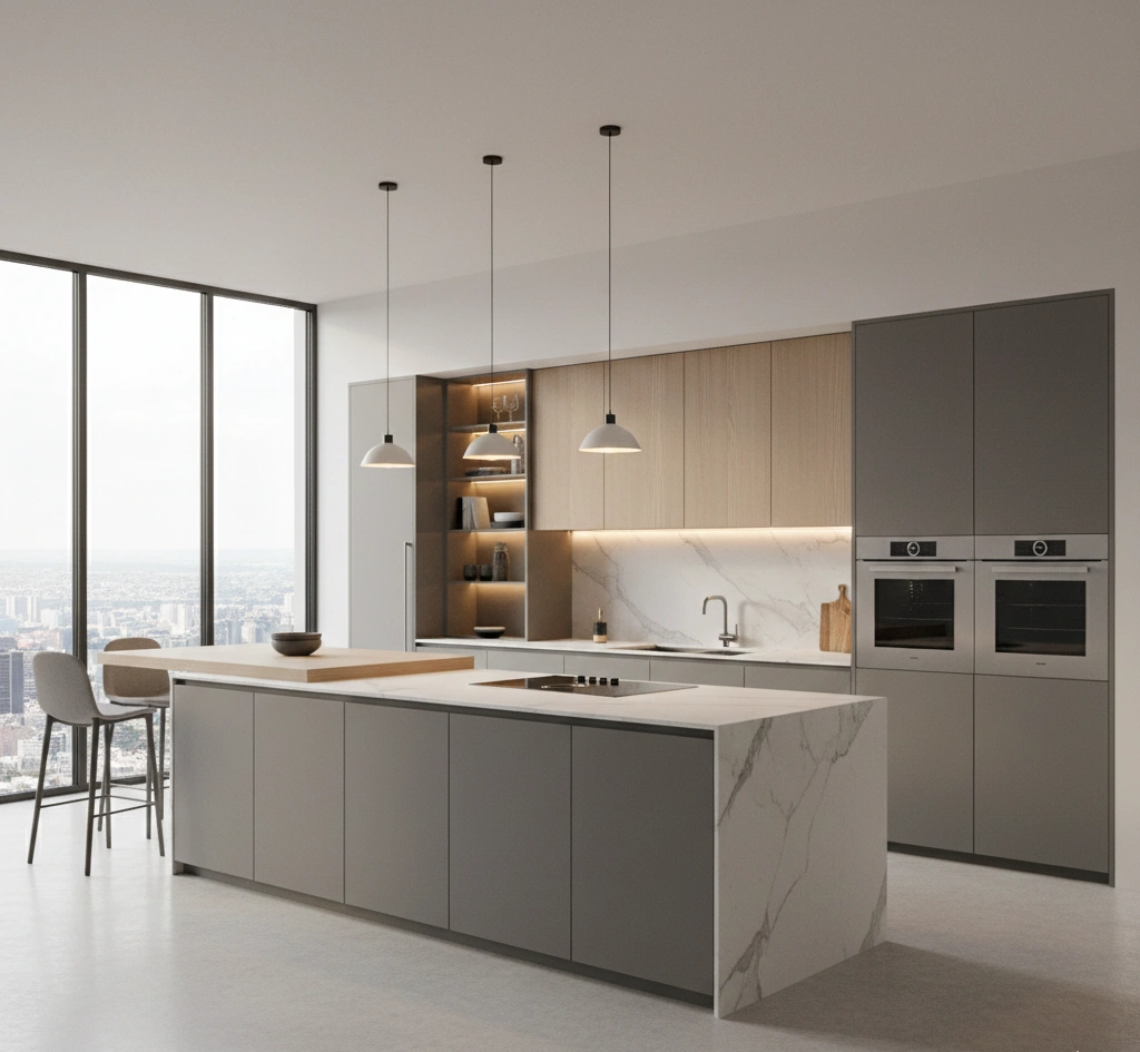 Подбор материалов. Это тактильная стадия. Мы привозим образцы: срезы древесины, плитки, ткани. Обратная сторона медали работы с природными элементами — возможная неоднородность оттенка, что является частью эстетики.- Производство в цехе. Работа делится на участки: раскрой на ЧПУ, сборка «белого» корпуса, покраска. Современный цех — это скорее хирургический кабинет, где царят чистота и точность.