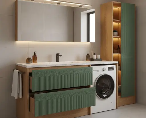 Подбор — это всегда поиск баланса между желаемым дизайном, бюджетом и условиями эксплуатации. Основной компромисс здесь заключается в том, что ради существенной экономии часто приходится мириться с повышенными рисками набухания и деформации при постоянном контакте с влагой. Рассмотрим основные варианты. Влагостойкая ДСП (ВДСП) с покрытием ПВХ/пластик. Это наиболее бюджетное решение с широким выбором цветов и текстур, в том числе имитирующих дерево или камень. Обратная сторона медали: даже влагостойкая ДСП боится прямого и постоянного попадания воды на незакрытые кромки. Со временем на самых нагруженных кромках может наблюдаться расслоение. Срок службы в агрессивной среде ванной — короче, чем у других материалов. Подходит для комнаты с хорошей вентиляцией или бюджетных проектов. МДФ с акриловым или пластиковым покрытием, покрашенный МДФ. Более плотный и устойчивый к влаге материал. Позволяет создавать глянцевые (акрил) и матовые (краска) поверхности высочайшего качества, скругленные фасады. Акриловый фасад обладает эффектом глубины. Компромисс: цена выше, чем у ДСП. Глянцевые поверхности требуют ухода от разводов. При выборе крашеного МДФ качество напрямую зависит от технологии покраски. Идеально для проектов, где дизайн и долговечность стоят на первом месте. Массив дерева (дуб, ясень, тик) с профессиональной влагозащитной обработкой. Премиальный, «живой» внешний вид, экологичность. При повреждении может быть отреставрирован. Компромисс: самый дорогой вариант. Даже самая качественная обработка не делает дерево вечным во влажной среде. Оно требует особого микроклимата и регулярного ухода. Подходит для просторных ванных с отличной вентиляцией.