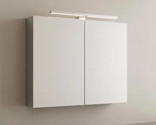 Разберем цену на примере популярной комплектации: прямая тумба под раковину 800 мм с двумя ящиками, зеркало с подсветкой и навесной шкаф.