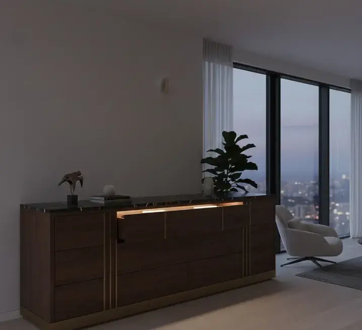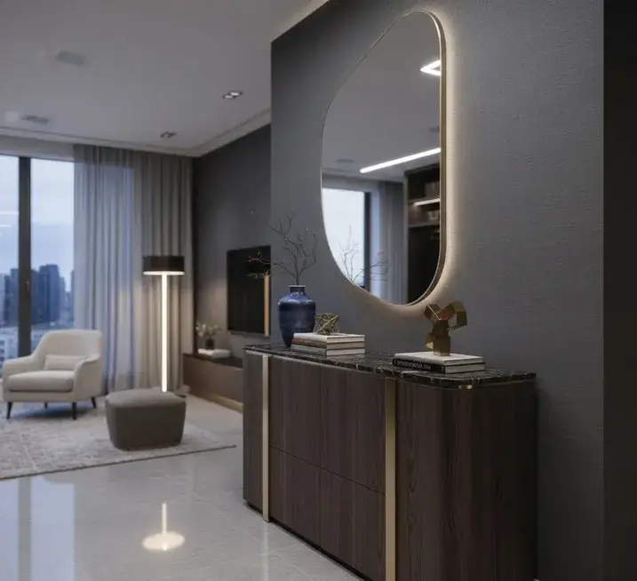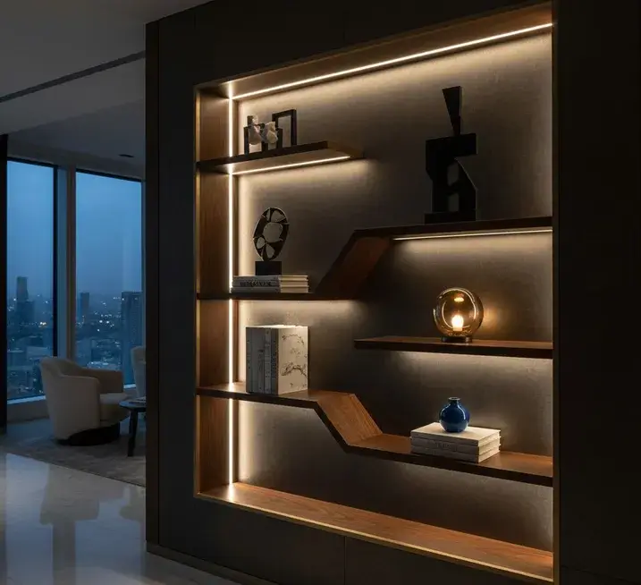 Световые сценарии — это то, что отличает современный проект от устаревших «стенок». Подсветка может быть как функциональной (внутри ящиков), так и декоративной, создающей эффект «парения» подвесных тумб. Это добавляет интерьеру глубины и уюта в вечернее время. Весь дизайн строится на балансе материалов: сочетание холодного камня столешниц и теплого дерева фасадов создает живой, наполненный смыслом интерьер.