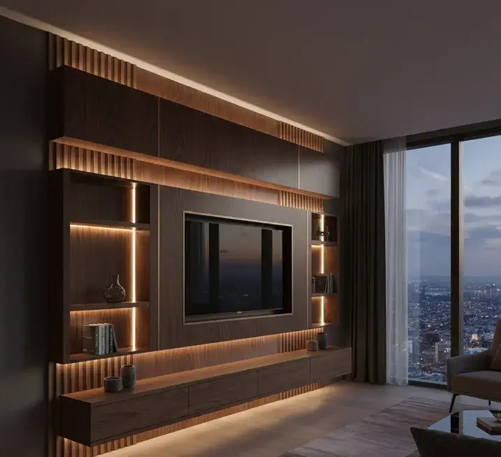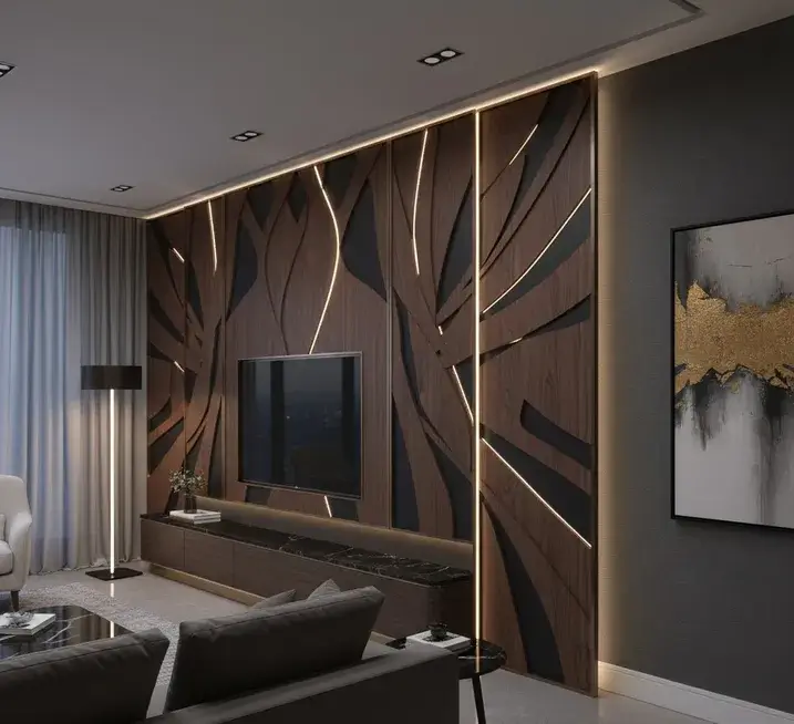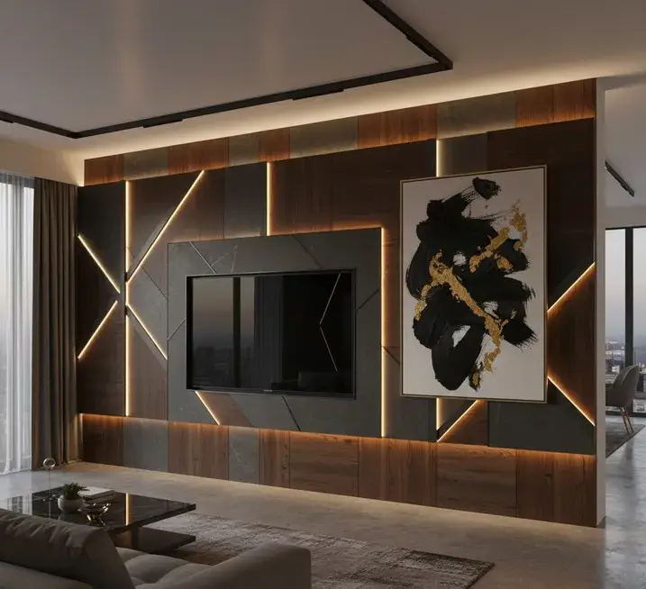| Дизайнерская ТВ-зона с панелями (рейки, шпон, керамогранит) | от 4 710 600 сум | 14–21 день |