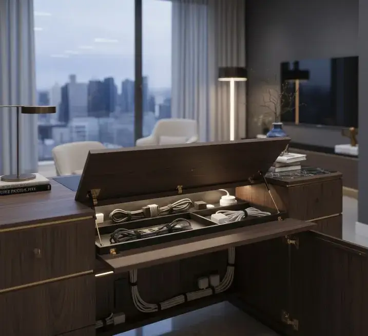 Индивидуальная мебель на заказ для гостиной подразумевает глубокую интеграцию техники. Мы проектируем скрытые кабель-каналы, которые избавляют интерьер от визуального шума проводов. Внутренние отсеки оснащаются вентиляционными решетками, чтобы игровые консоли или аудиосистемы не перегревались в закрытых нишах. Это превращает обычный шкаф в технологичную базу для всех домашних развлечений.