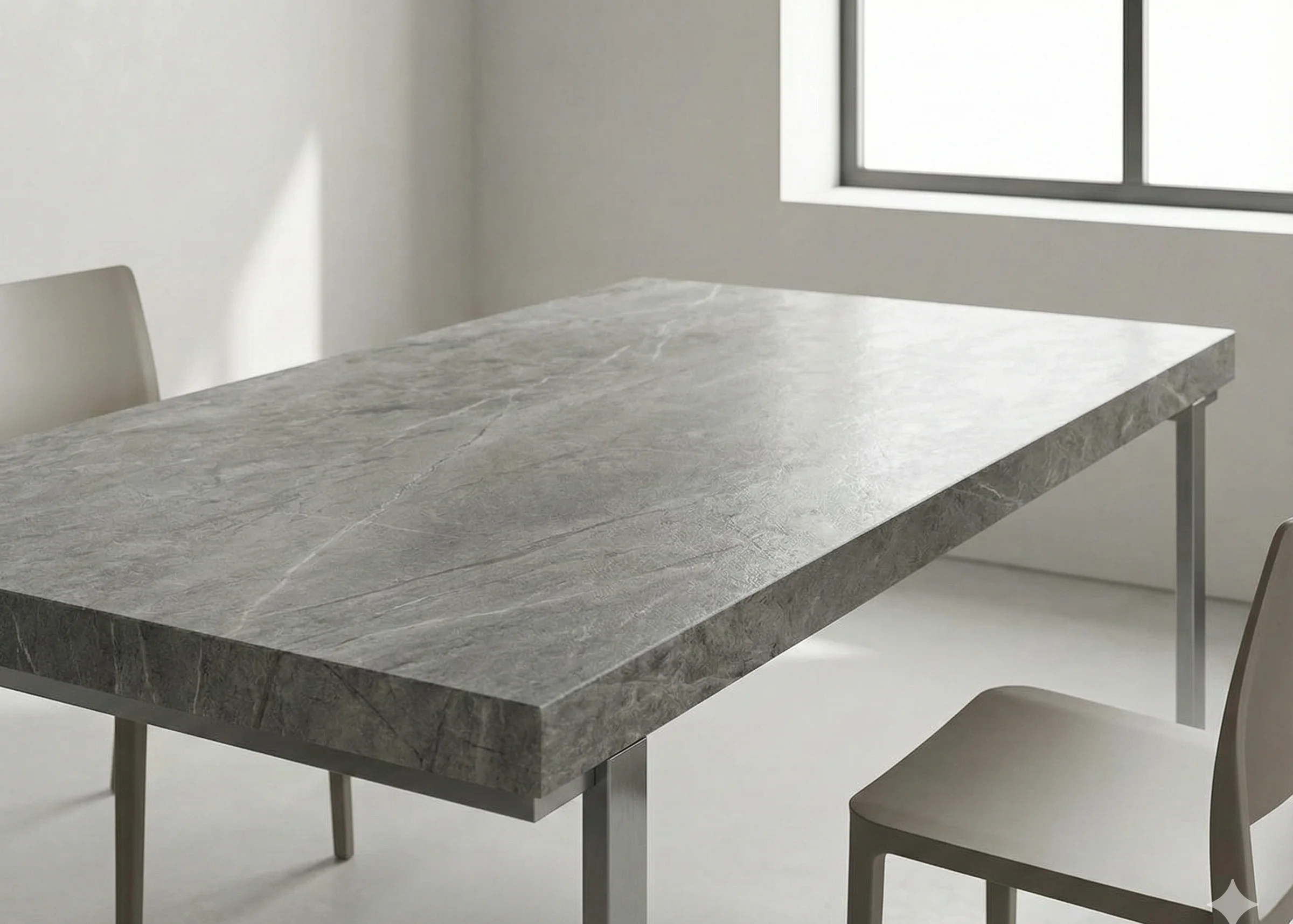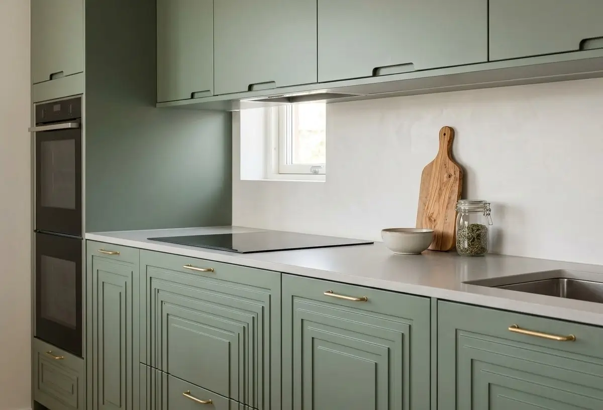 - HPL-Пластик. Самый выносливый тип отделки. Он не боится царапин, агрессивной бытовой химии и сильного нагрева, что делает его фаворитом для рабочих зон кухни.