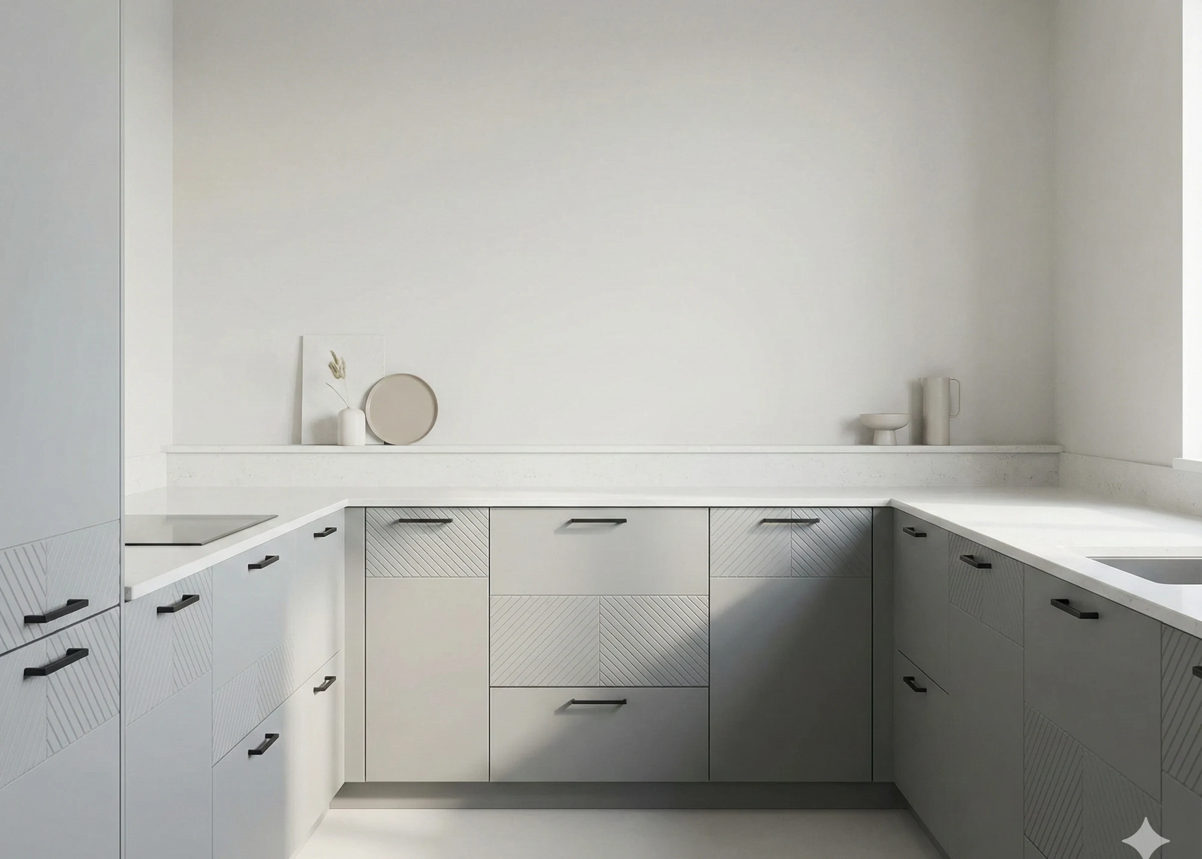 Дизайнер выезжает с образцами 200+ текстур МДФ. Создаем точный макет в PRO100 за 45 минут, учитывая кривизну стен и расположение розеток с точностью до миллиметра.