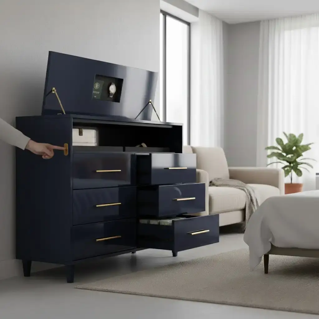 Когда проектируются комоды на заказ, в расчет берется нестандартная глубина, что критично для прихожих. Также подбирается индивидуальная высота под задачи: например, для пеленального комода оптимально 90–95 см, а для медиа-зоны под ТВ достаточно 50–60 см. Не менее важна и конфигурация ящиков, когда вместо набора одинаковых секций создается комбинированная система: узкие верхние отсеки для украшений и глубокие нижние для объемного домашнего текстиля.