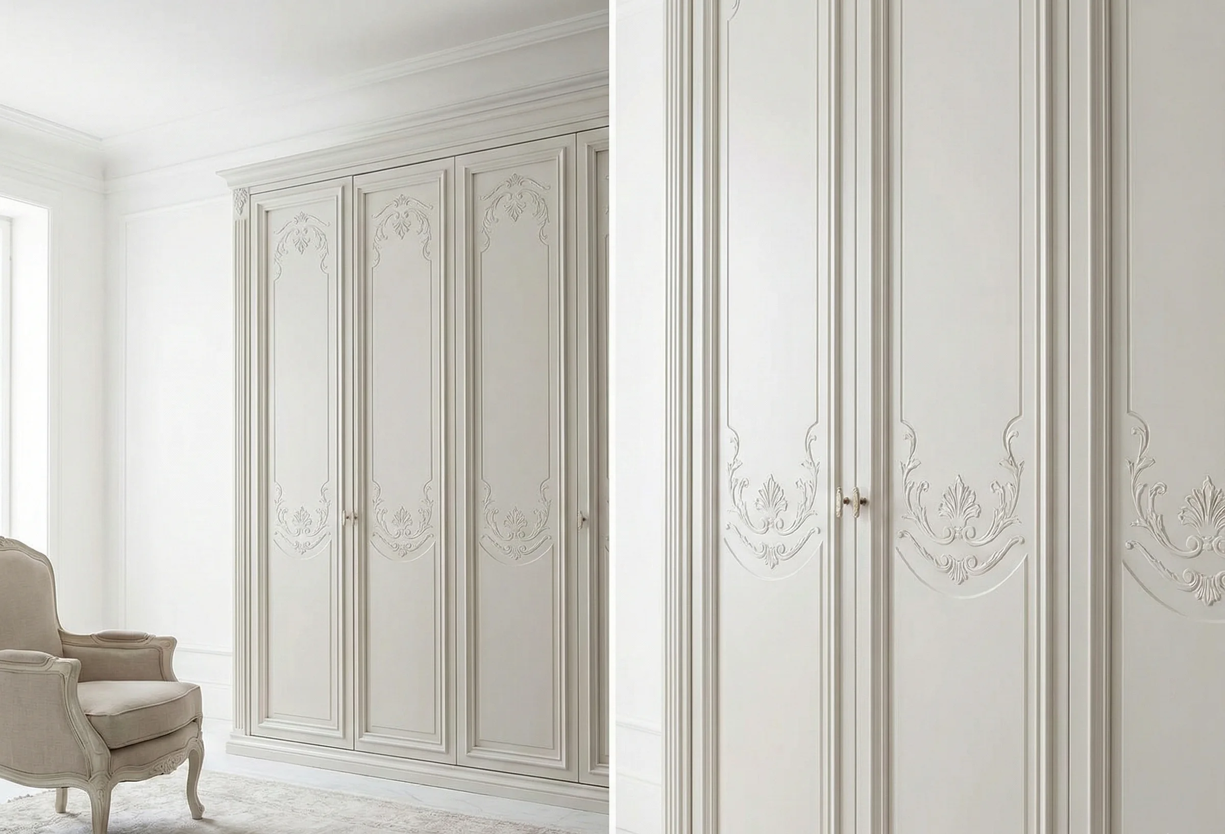 Дизайнер приезжает с каталогом (300+ декоров). За 40 минут создаем проект, где каждая полка рассчитана под ваши вещи: от длинных пальто до коробок с обувью.