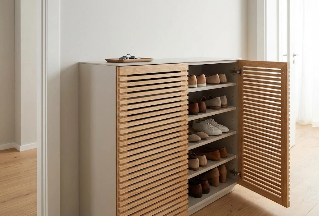 Жалюзийный шкаф на заказ — это не только актуальный эстетический прием, но и выверенное инженерное решение. Система реек, спроектированная по принципу жалюзи, оставляет между планками зазоры для постоянной пассивной вентиляции. Благодаря этому воздух обновляется естественным образом, влага не застаивается, а ваш гардероб сохраняет безупречную свежесть.