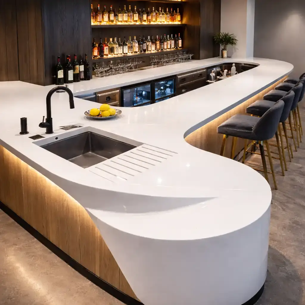 Изготавливаем прямые, угловые и радиусные столешницы для барных стоек. Учитываем планировку помещения и сценарии использования.