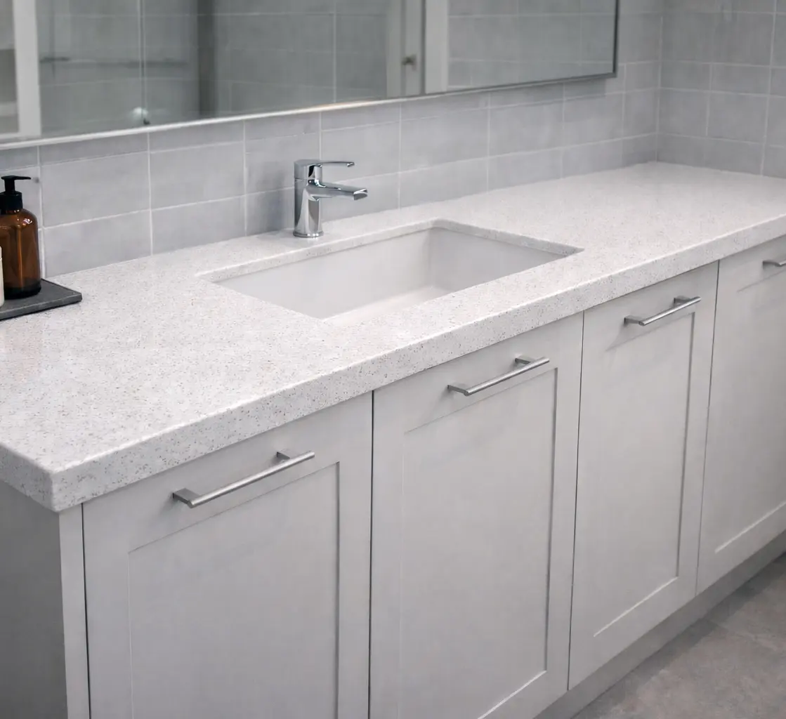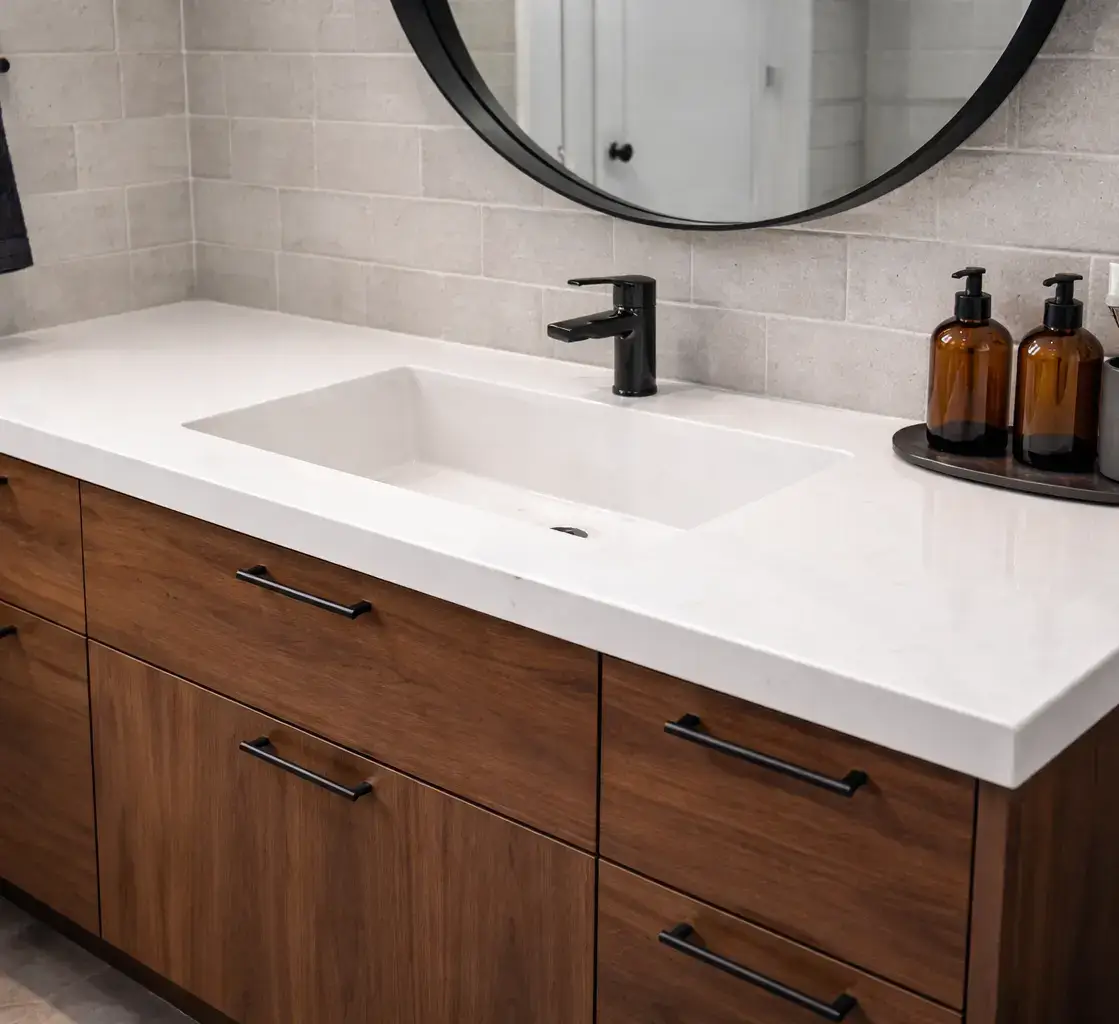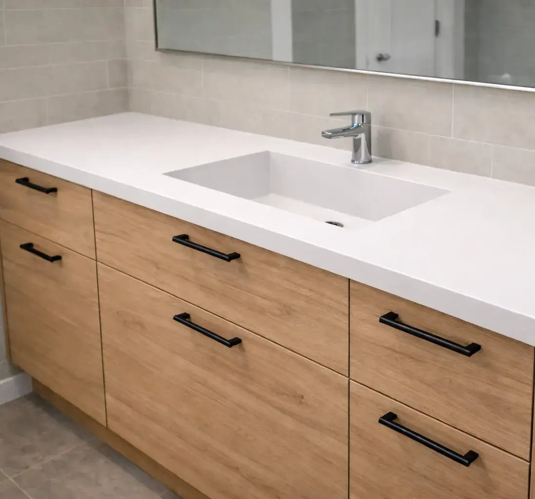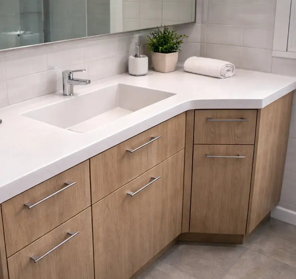 Изготавливаем столешницы по индивидуальным замерам. Учитываем ниши, углы, примыкания к стенам и особенности планировки ванной комнаты.