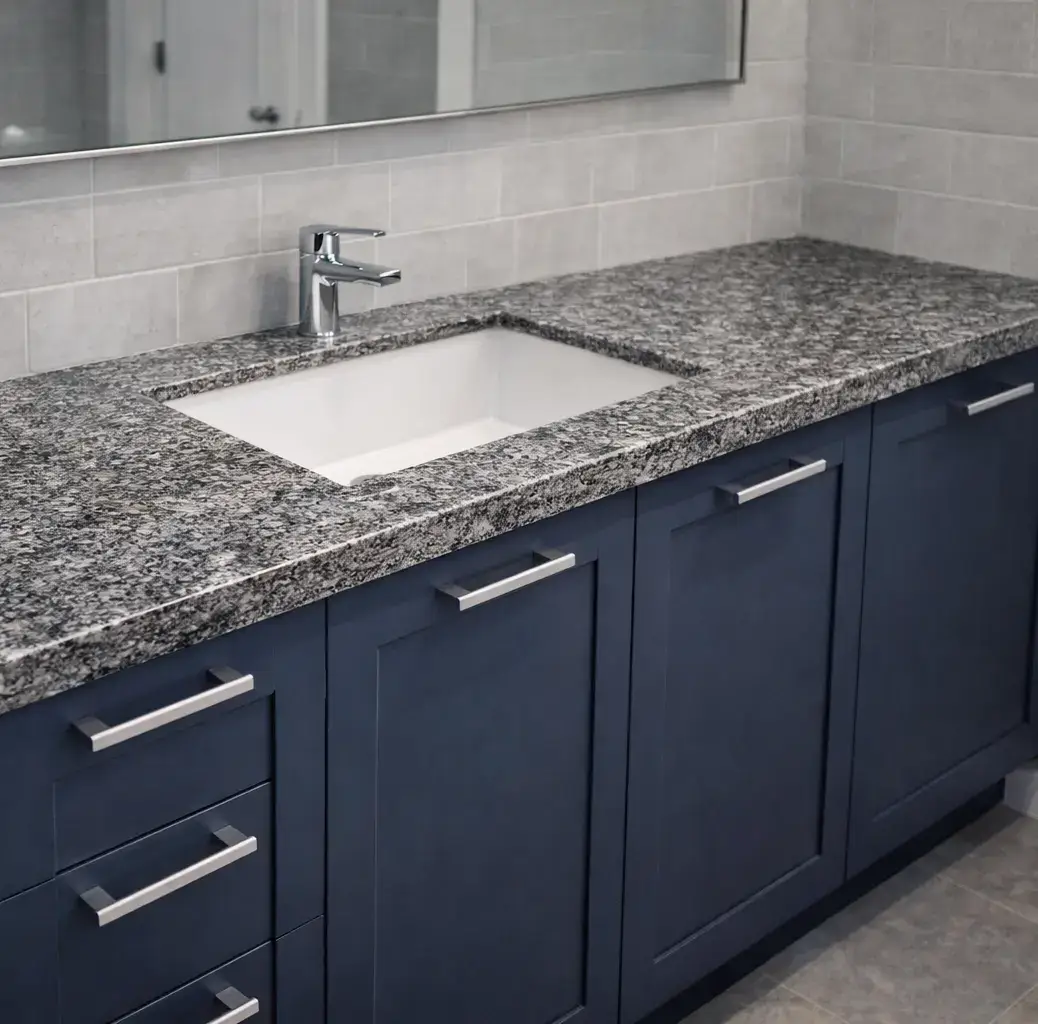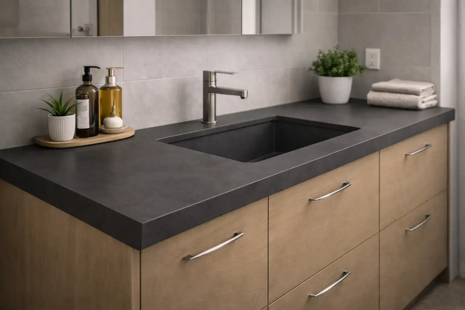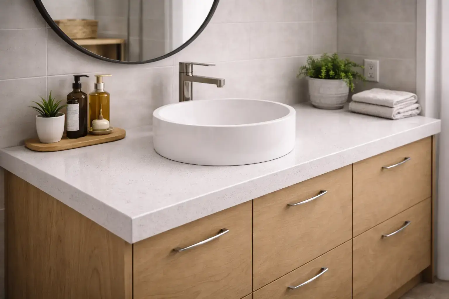 Изготавливаем столешницы по индивидуальным замерам. Учитываем ниши, углы, примыкания к стенам и особенности планировки ванной комнаты.