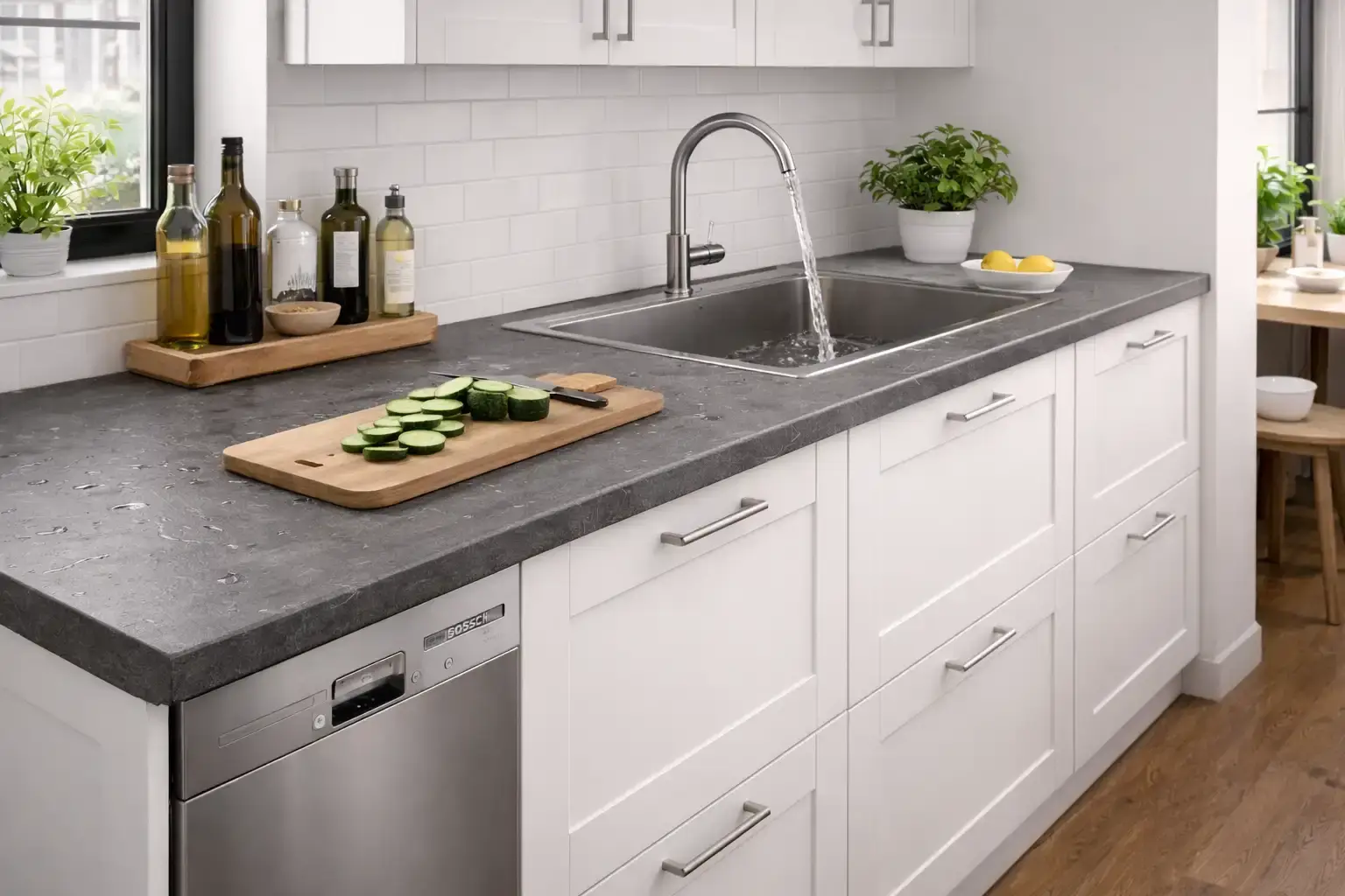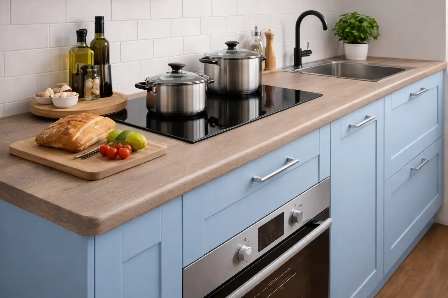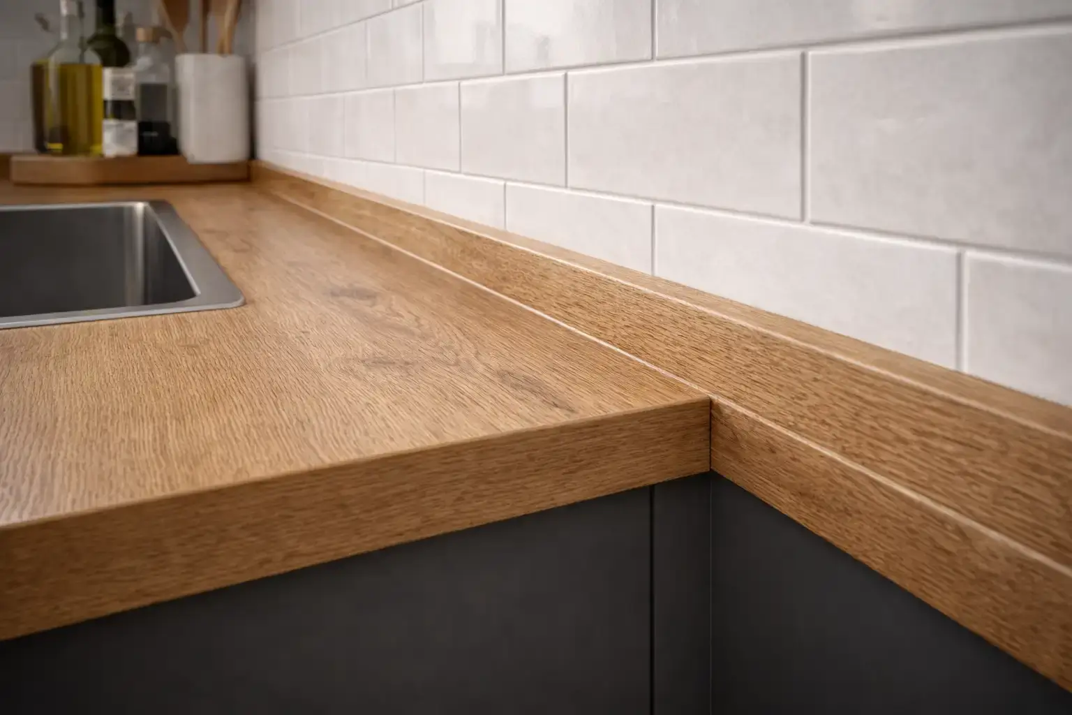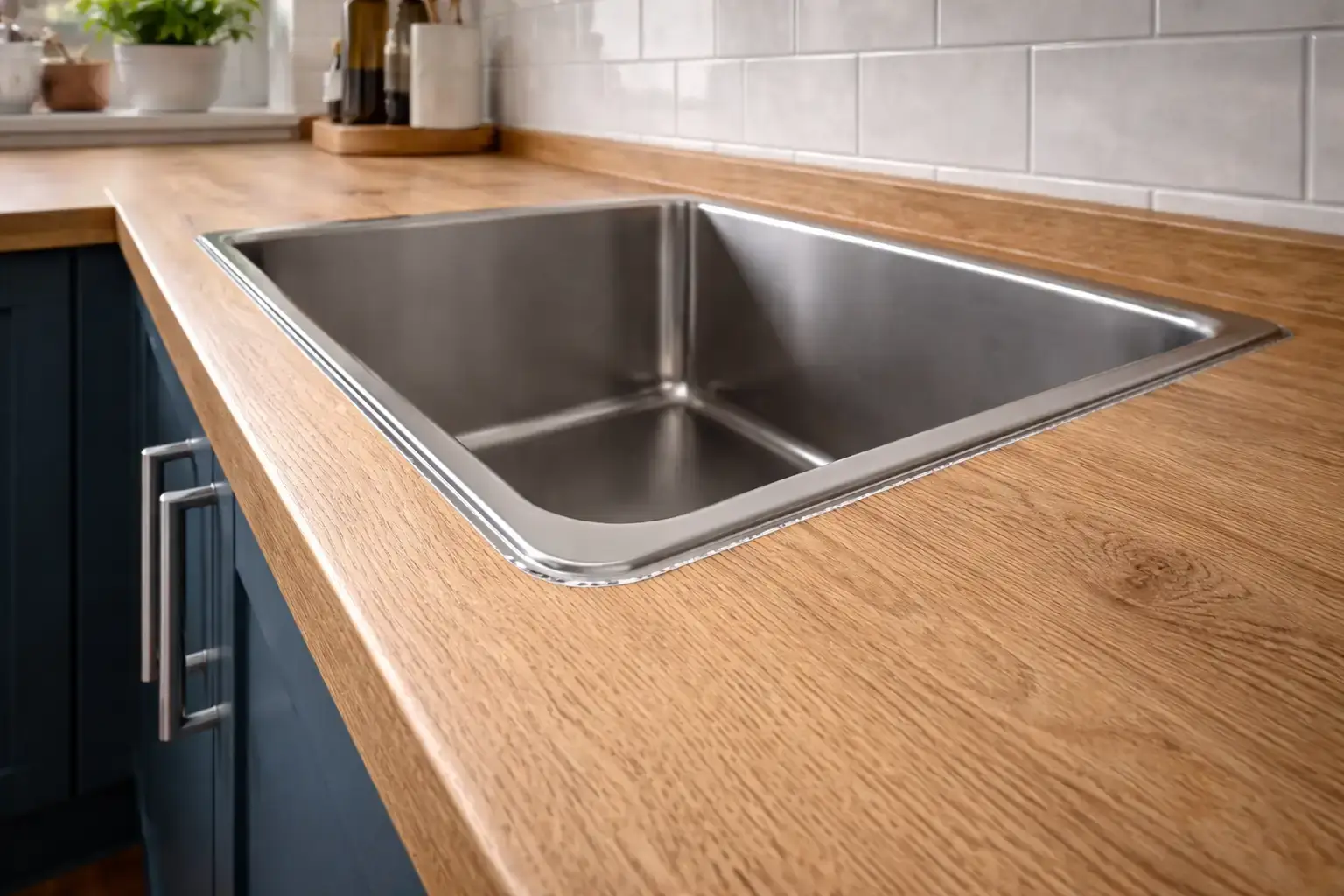 Применяем полиуретановую кромку, которая создает бесшовный барьер. Это на 100% блокирует попадание пара и воды в структуру МДФ/ДСП, исключая вздутие на стыках у мойки.