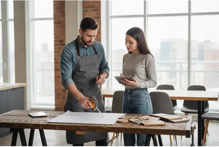 Делаем стол по миллиметрам: ширина/глубина/высота под рост и помещение. Замер в Ташкенте занимает до 60 минут, учитываем розетки и проходы.