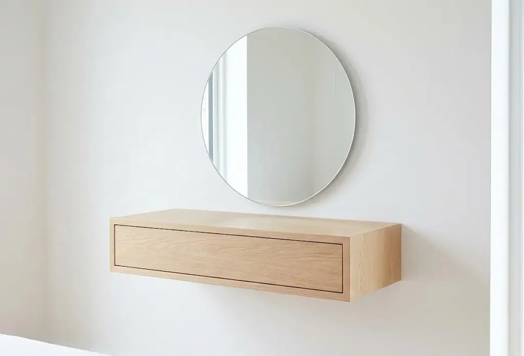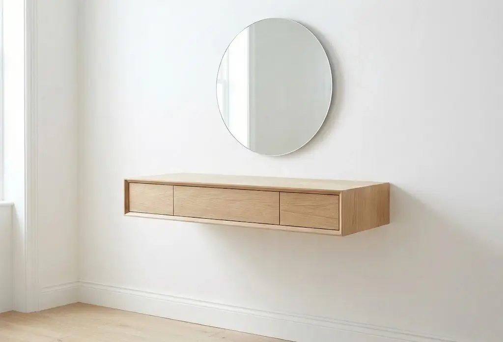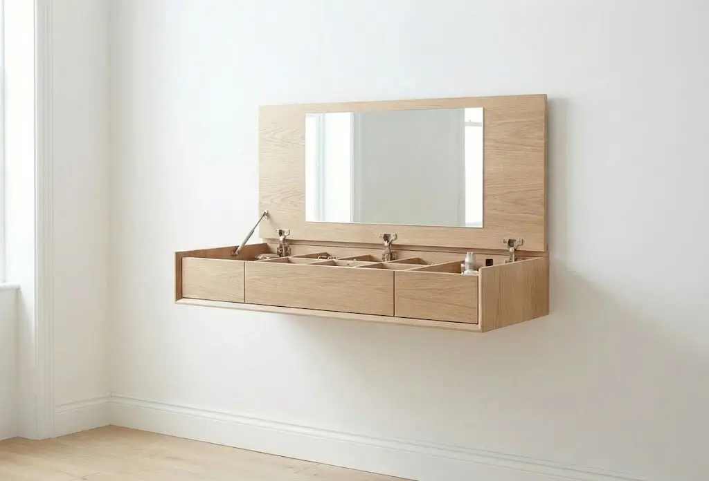 Стандартная высота столешницы составляет 75–80 см, но если вы планируете сидеть на пуфе, расчет должен быть индивидуальным. Главное правило: расстояние от коленей до нижней части столешницы — не меньше 15 см. Глубина менее 40 см сделает столик бесполезным для расстановки всех средств. Каждый туалетный столик с зеркалом на заказ должен учитывать рост владелицы и высоту ее любимого сиденья.