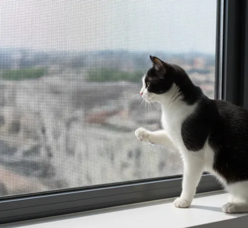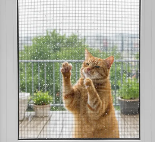 Стальное полотно выдерживает прыжок взрослого мейн-куна весом до 15 кг и давление до 80 кг. Когти не рвут металл, полностью исключая риск падения питомца из окна.