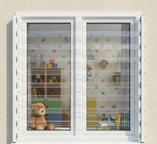 Прочный алюминиевый профиль и стальные тросы не прогнутся, даже если на решетку обопрется взрослый. Надежнее москитной сетки в 20 раз — ребенок точно не выдавит ее.