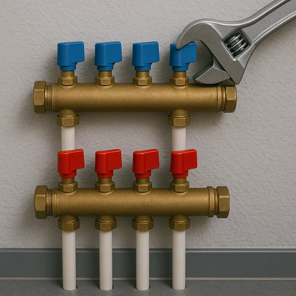 Если вы заметили капли воды или струйку из гребенки, немедленно перекройте подачу воды или теплоносителя. Подставьте ёмкость для сбора воды и протрите место утечки. Не пытайтесь затягивать фитинги без подходящего инструмента — это может повредить резьбу. До приезда мастера можно обмотать место течи сантехнической лентой или герметизирующей пастой для временного устранения.