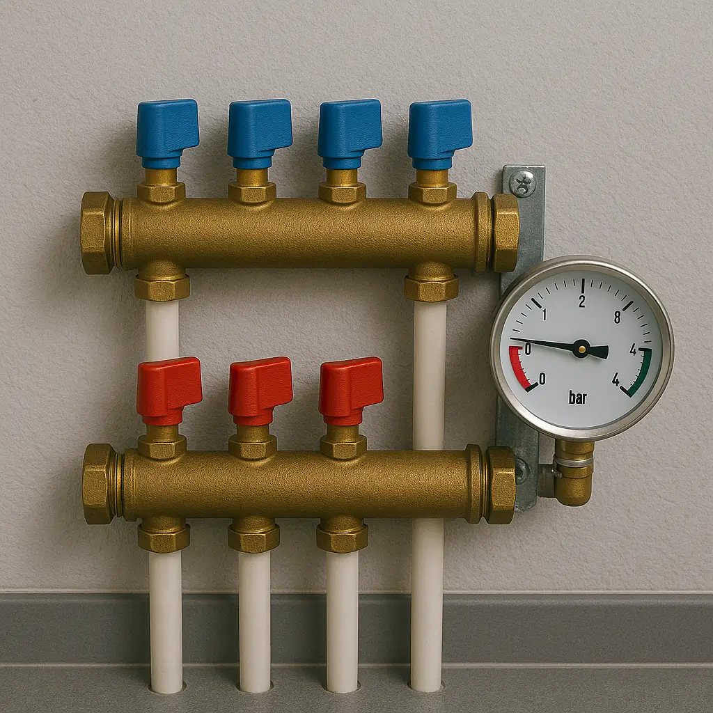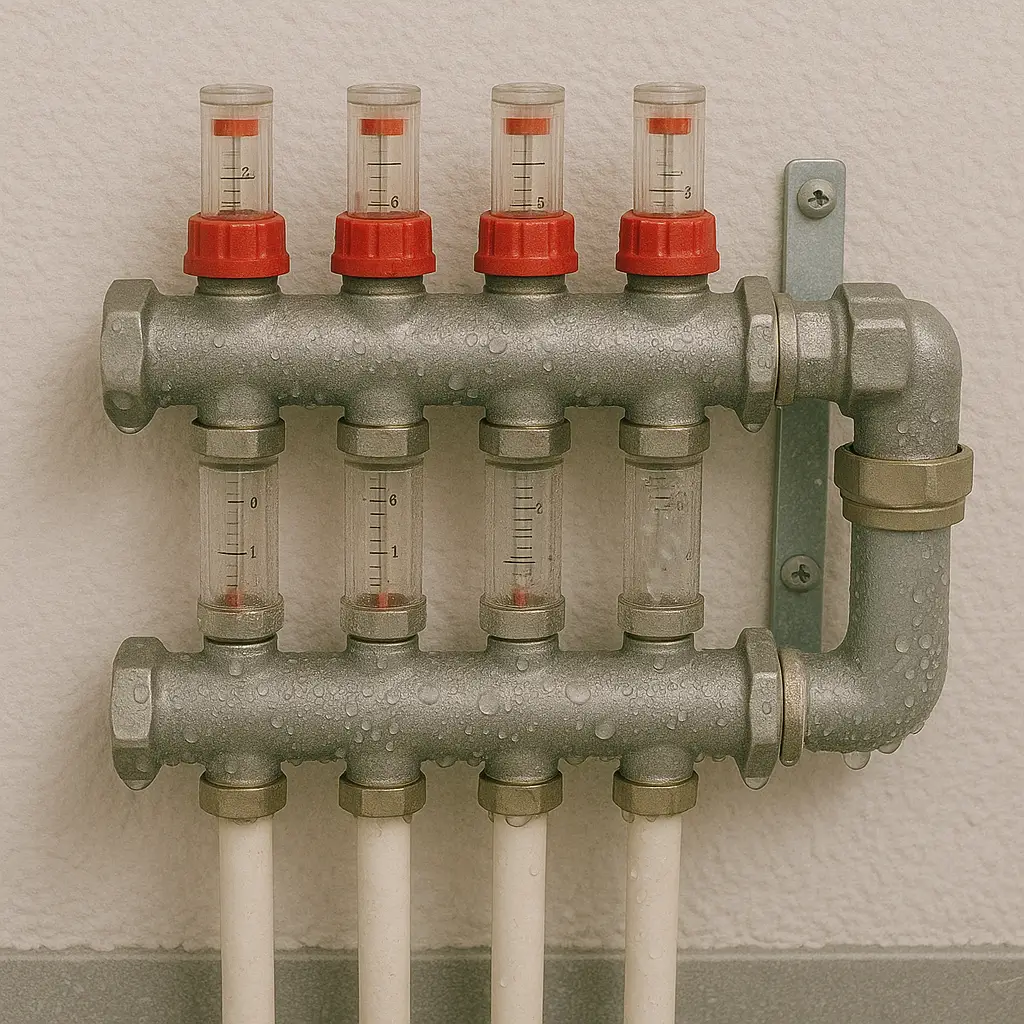 Если в трубах слышен шум, бульканье или неравномерный нагрев, вероятно, система завоздушена. Откройте воздухоотводчики на гребенке, начиная с верхних контуров, и дождитесь выхода воздуха. Делайте это осторожно — возможен выброс горячей воды. После удаления воздуха проверьте давление в системе. Если оно ниже нормы, не доливайте самостоятельно — мастер восстановит баланс правильно.