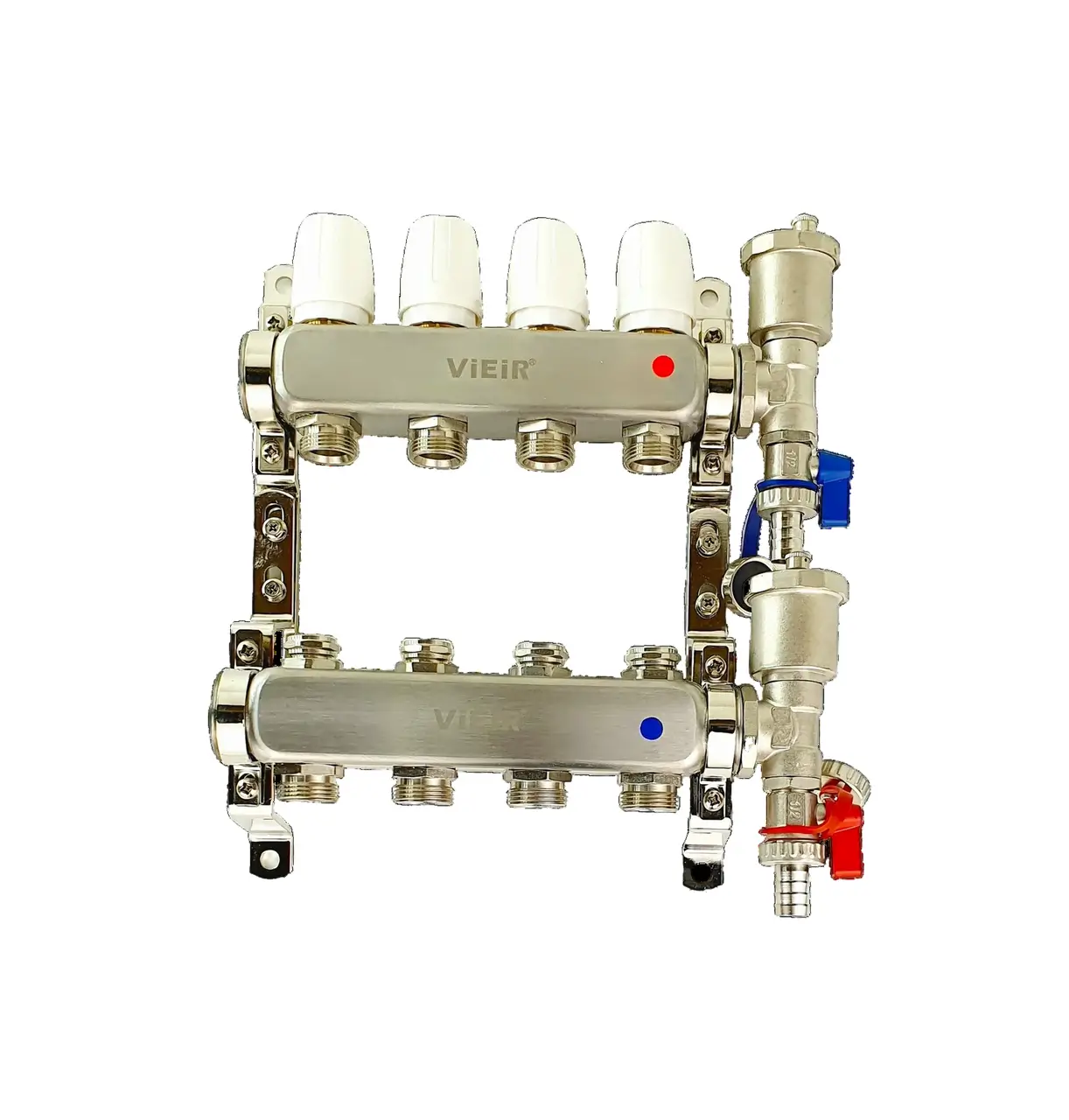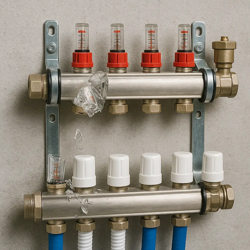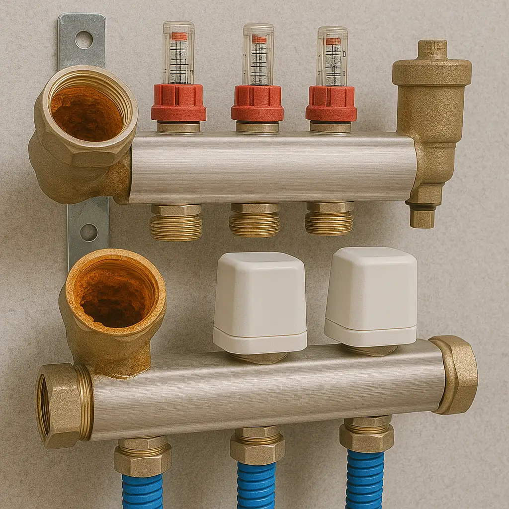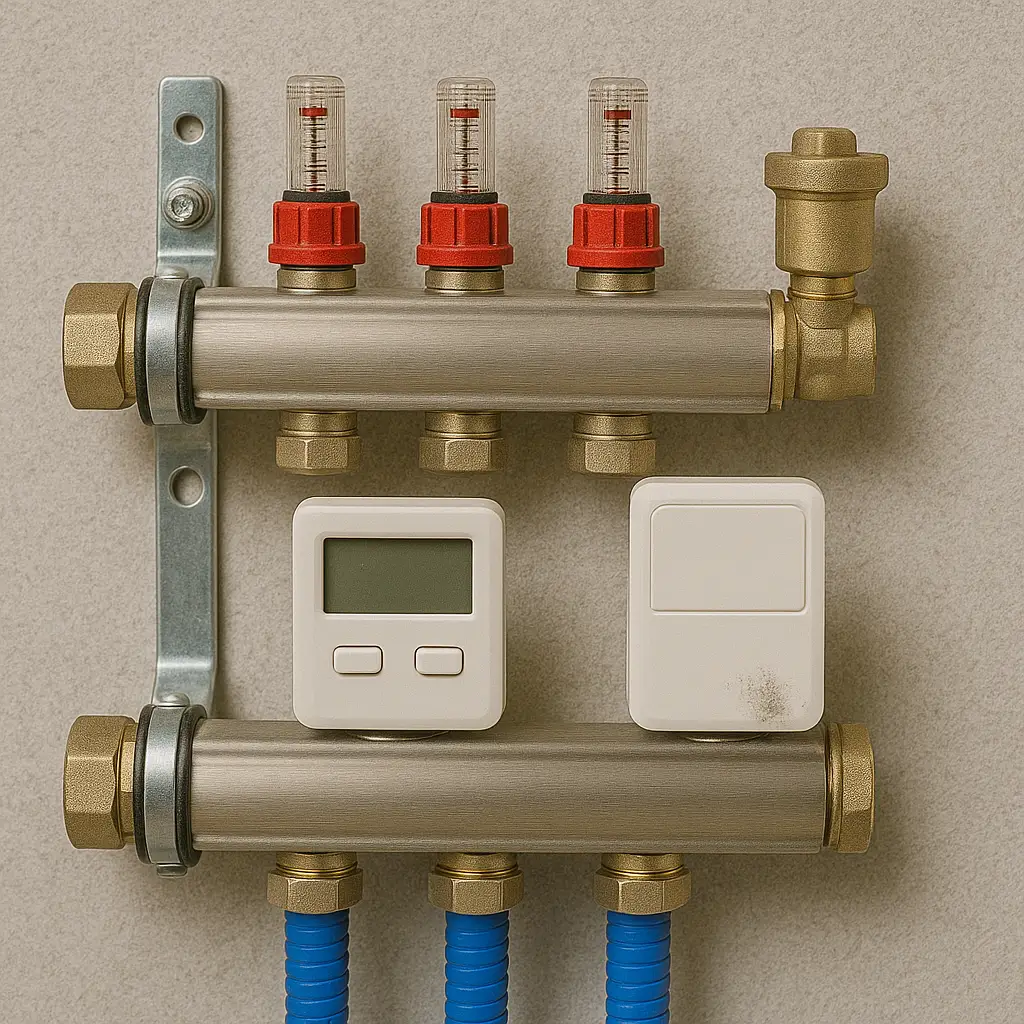 Основные компоненты — латунная или нержавеющая гребенка с шаровыми кранами, расходомеры для контроля потока теплоносителя, автоматические воздухоотводчики и сливные клапаны. Дополнительно устанавливаем термоголовки для регулировки температуры и сервоприводы для работы с комнатными термостатами. Качественный монтаж коллекторов отопления всегда включает установку грязевиков для защиты оборудования.